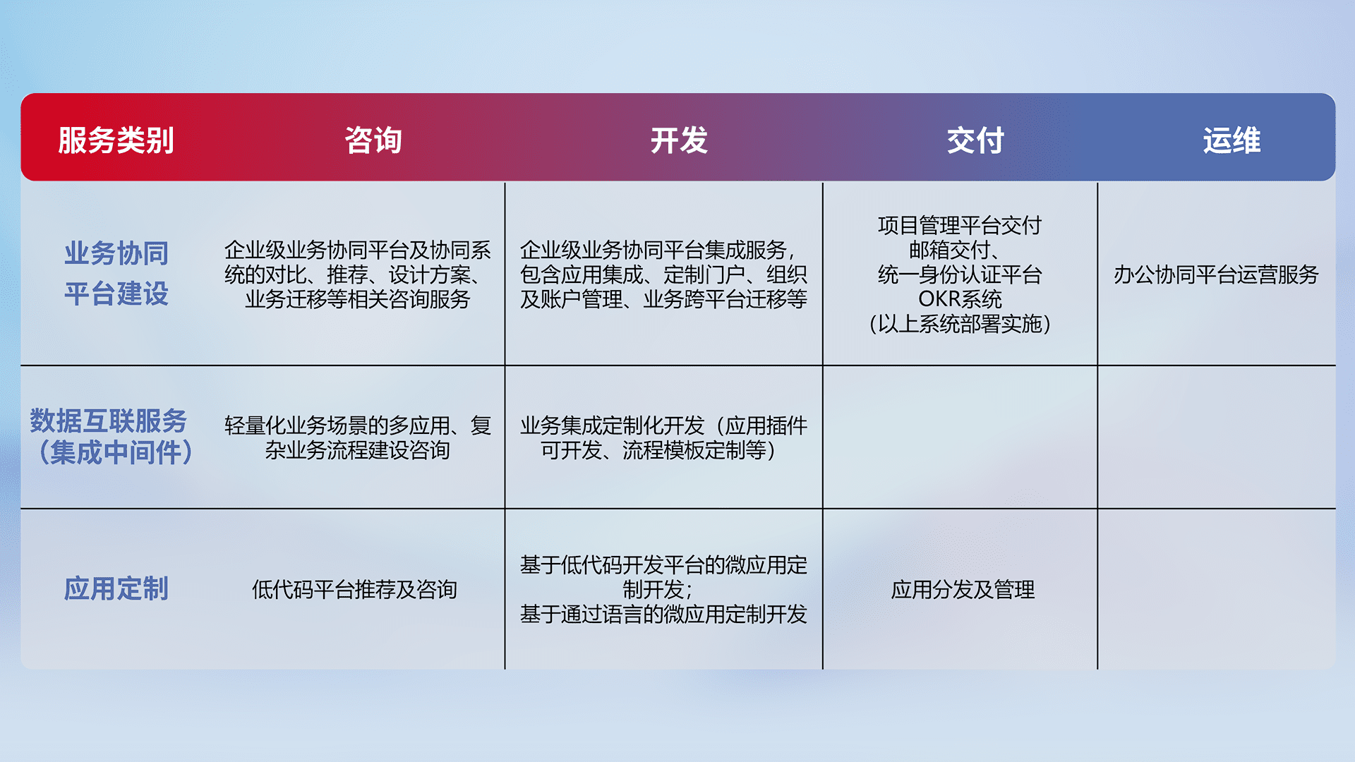 针对钉钉、、、企微、、、IDaas等平台级产品提供产品的规划、、、、方案、、、交付、、、、定制化开发等服务,,,实现如统一协同办公、、智能客户服务、、混合会议管理、、、、智能数据查询、、、、等业务场景,,,实现数字化转型。。。。