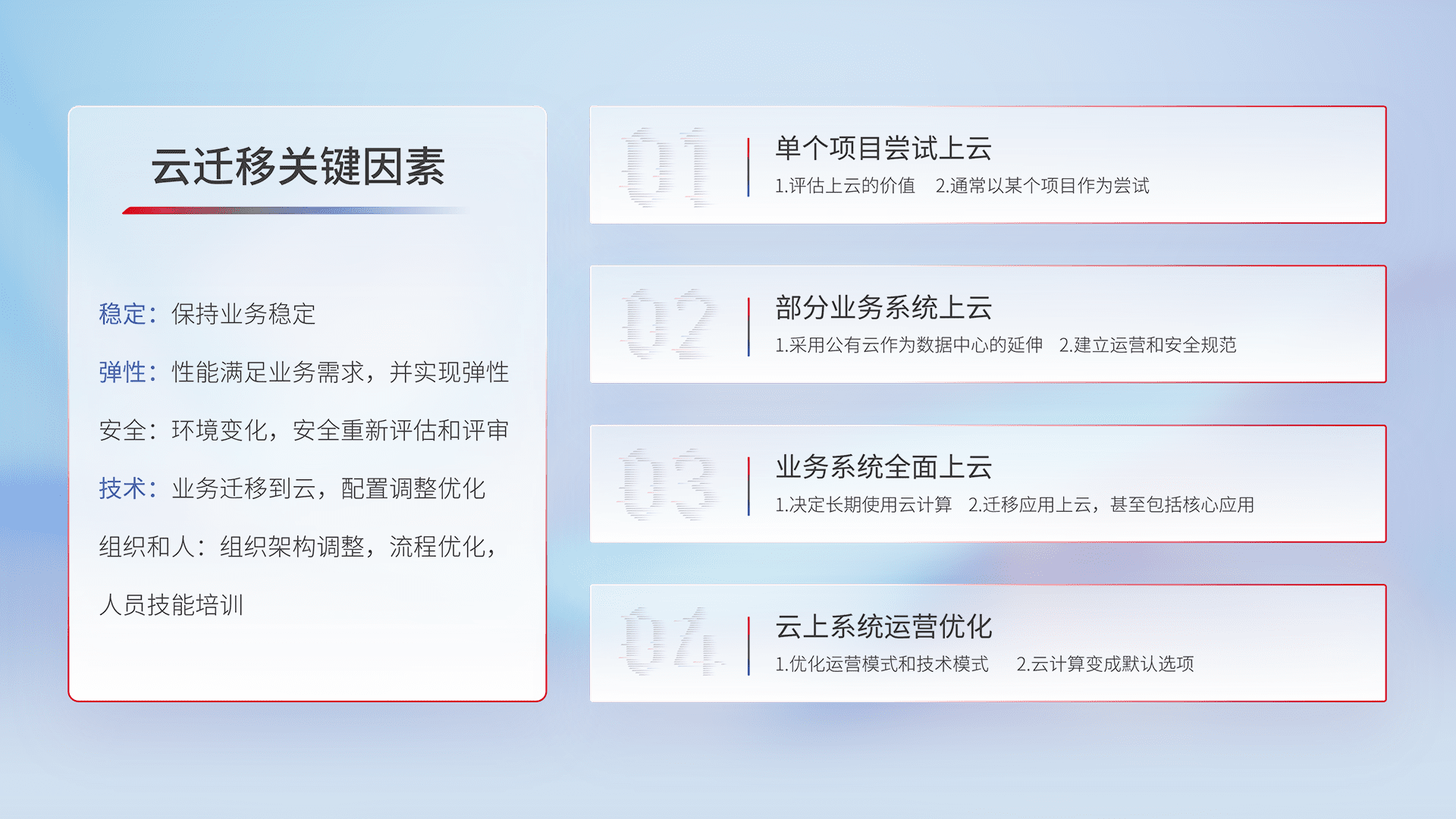 结合实际业务,,,从规划设计、、、、云平台选型、、云原生改造、、数据迁移、、、、集成交付,,迁移全过程为客户识别最佳上云路径,,做好风险识别管理,,,,设计网络架构、、、身份权限、、安全审计合规、、、操作审计、、日志审计、、、监控告警策略、、多站点容灾设计等,,,对云上基础设施进行整体规划,,提升IT治理水平,,以满足弹性、、、、高可用、、高性能的需求。。