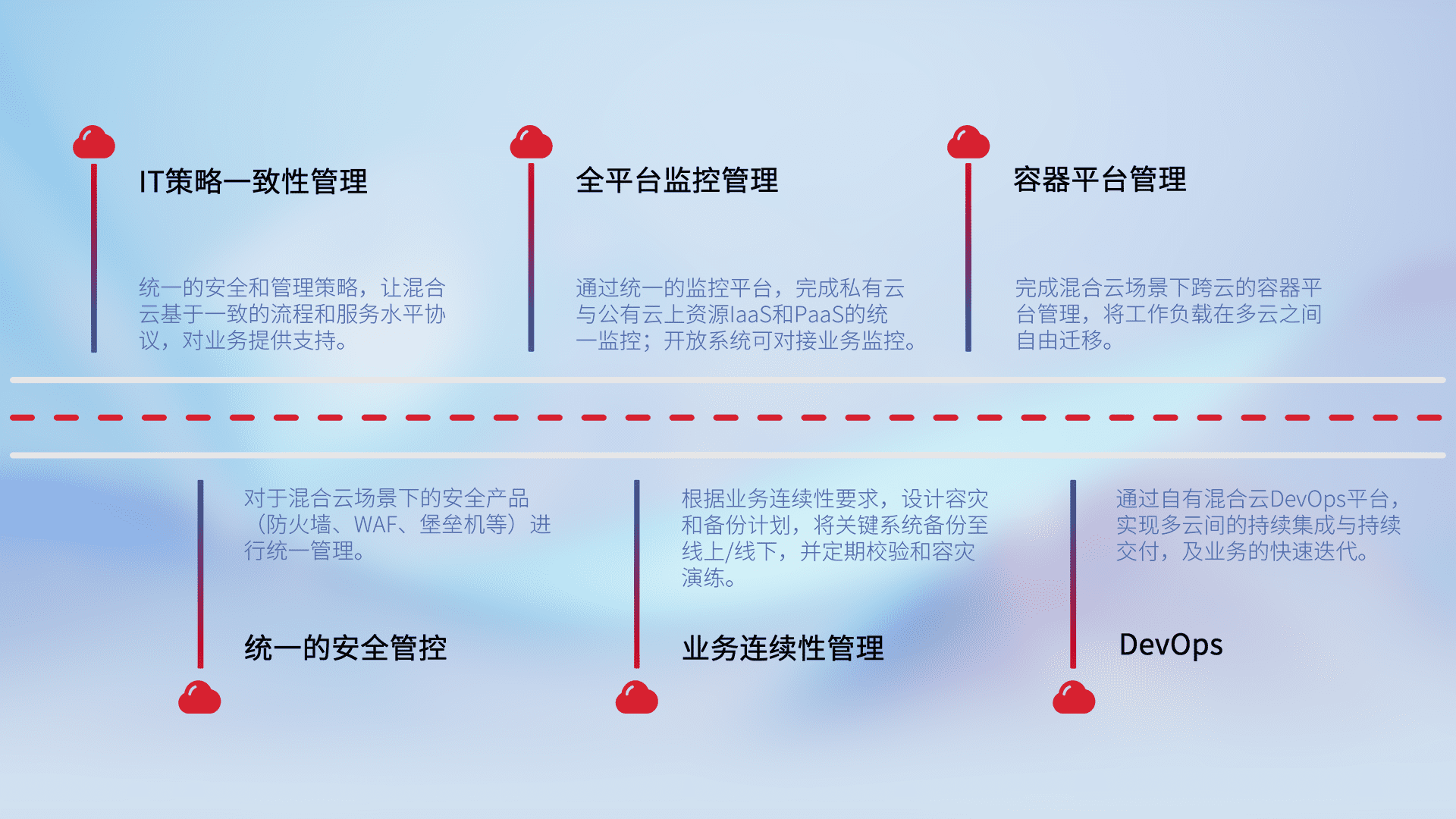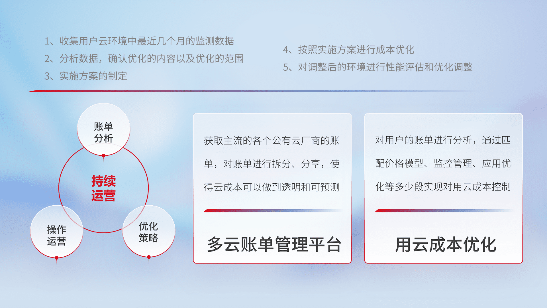 通过多云纳管,,,以统一的资源数据模型把客户的云资源进行抽象和封装,,,,进而实现对多云资源的统一操作,,保障云资源管理的可靠性、、、稳定性与可用性。。。量身定制化运维内容,,,配置、、、、开发运维、、、、补丁管理、、备份、、、、监控、、、、认证和访问管理、、、、审计和日常巡检等,,保障在用云过程中的可靠度,,,稳定度以及高可用率。。。。
