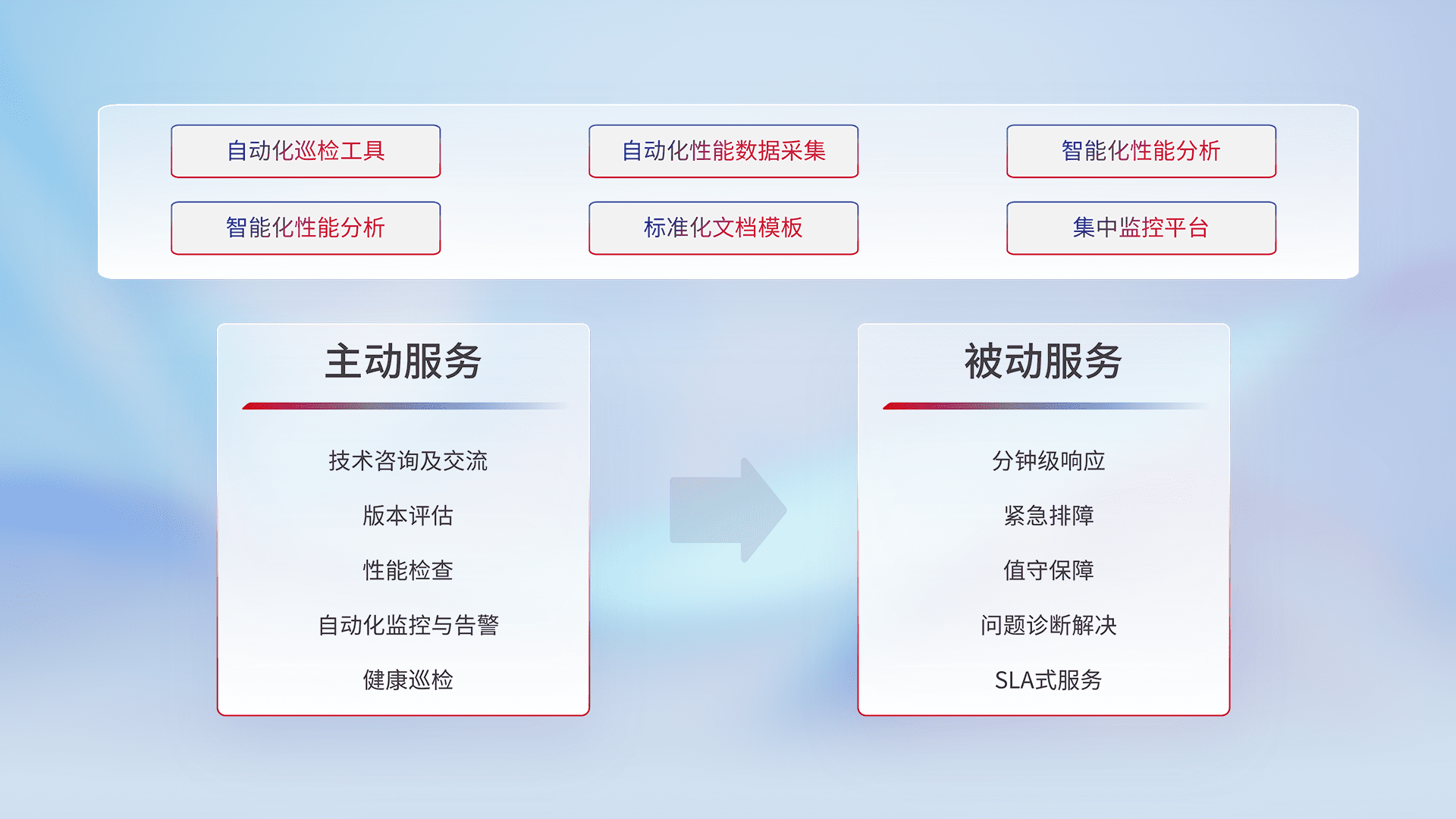 智能化工具和标准化文档,,保障服务质量,,,提供主动服务(包含技术咨询、、版本评估、、、性能检查、、自动化监控与告警、、健康巡检)和被动服务包含(分钟级响应、、、、紧急排障、、、、值守保障、、、、问题诊断解决、、SLA服务)。。。